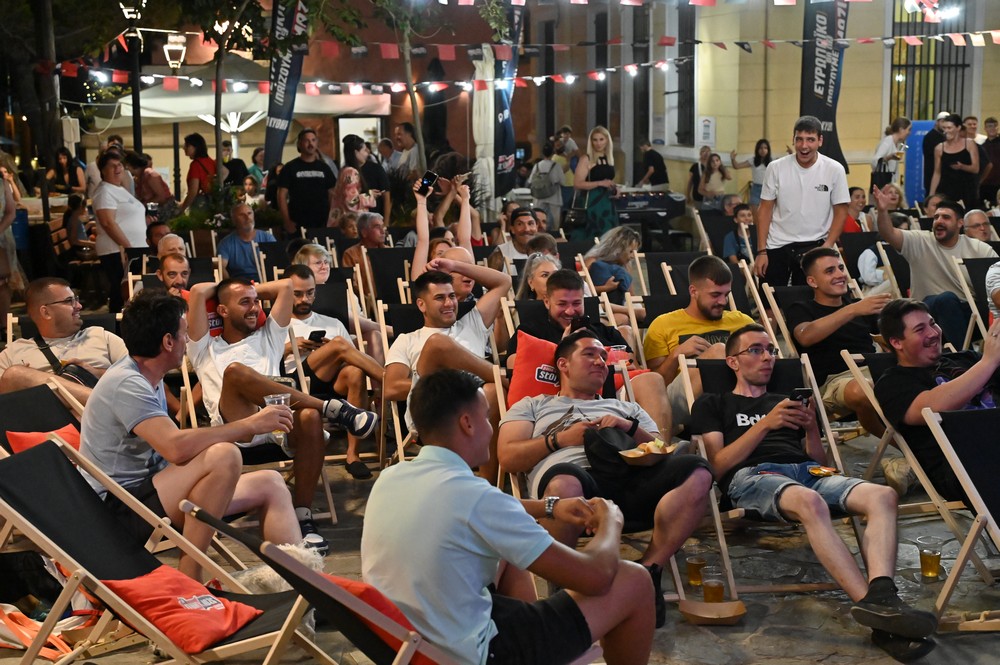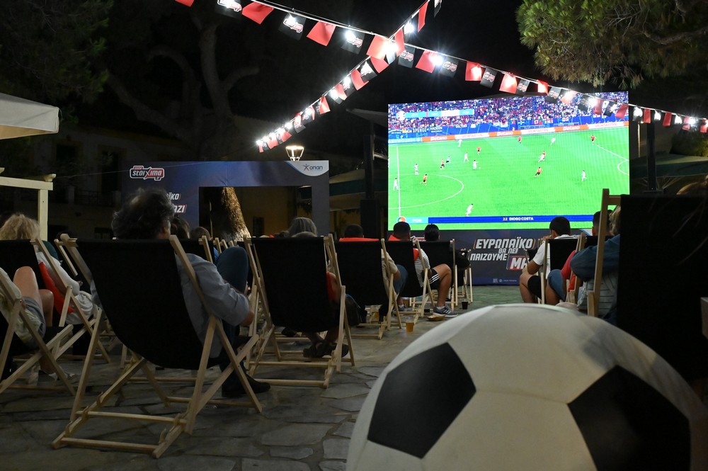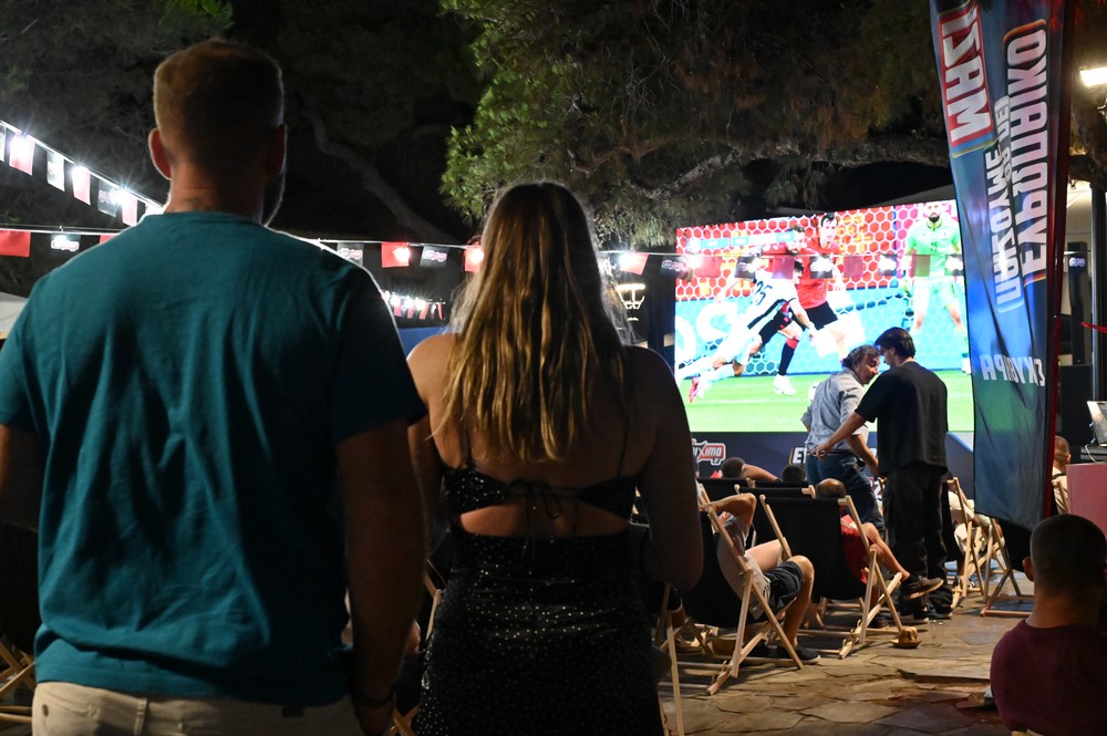 Οι φίλαθλοι δημιούργησαν τη δική τους ποδοσφαιρική κερκίδα στην πλατεία του χωριού, ζώντας με ένταση την εξέλιξη του αγώνα, την ώρα που απολάμβαναν γευστικά «ποδοσφαιρικά» σνακ.