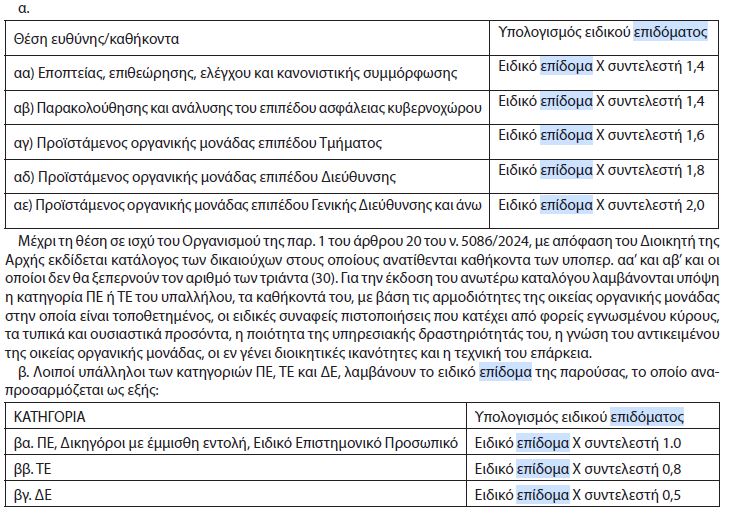 Οι δικαιούχοι που εισπράττουν τα 300 ευρώ είναι 188 εργαζόμενοι .Με απόφαση του Διοικητή της Εθνικής Αρχής Κυβερνοασφάλειας καταρτίζεται εξαμηνιαίος κατάλογος με το προσωπικό, μόνιμο, αποσπασμένο και απασχολούμενο με σχέση έμμισθης εντολής, και τους προϊσταμένους της Αρχής στους οποίους χορηγείται το ειδικό επίδομα και οι οποίοι δεν θα υπερβαίνουν τον αριθμό των εκατόν ογδόντα οκτώ (188). Ο κατάλογος του πρώτου εδαφίου καταρτίζεται, ανά οικονομικό έτος, ως εξής: