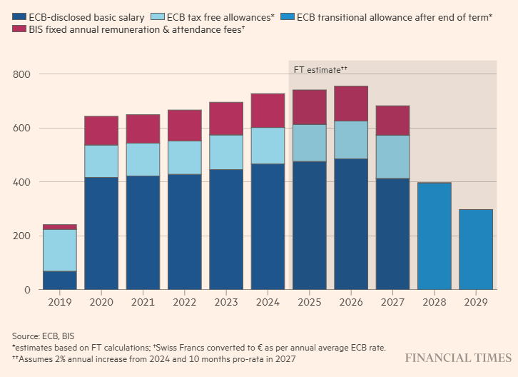 Λόγω εφάπαξ πληρωμών και πιθανών μεταβατικών αποζημιώσεων μετά το τέλος της θητείας της — που θα εξαρτηθούν από τον επόμενο ρόλο της — η Λαγκάρντ μπορεί να λάβει συνολικά έως 6,5 εκατ. ευρώ για τα οκτώ χρόνια ως πρόεδρος της ΕΚΤ, δηλαδή περίπου 810.000 ευρώ ανά έτος. Από το 2030, αναμένεται να λαμβάνει ετήσια σύνταξη περίπου 178.000 ευρώ από την ΕΚΤ, σύμφωνα με την ανάλυση των FT.