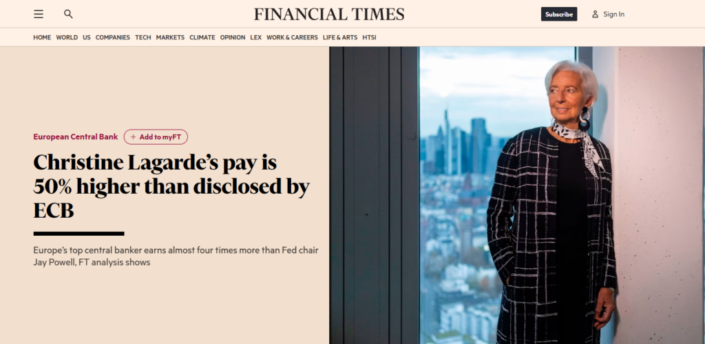Παρότι οι συνολικές αποδοχές της Λαγκάρντ θεωρούνται συγκρατημένες σε σύγκριση με τους διευθύνοντες συμβούλους μεγάλων ευρωπαϊκών εταιρειών, η ανάλυση των FT αναδεικνύει το πόσο περιορισμένη παραμένει η διαφάνεια σχετικά με τις αμοιβές στην ΕΚΤ. Η Ευρωπαϊκή Κεντρική Τράπεζα δεν υπόκειται στους ίδιους αυστηρούς κανόνες που ισχύουν για τις εισηγμένες εταιρείες στην ΕΕ, οι οποίες υποχρεούνται να παρέχουν μια «πλήρη και αξιόπιστη εικόνα των αποδοχών» κάθε μέλους της διοίκησής τους.