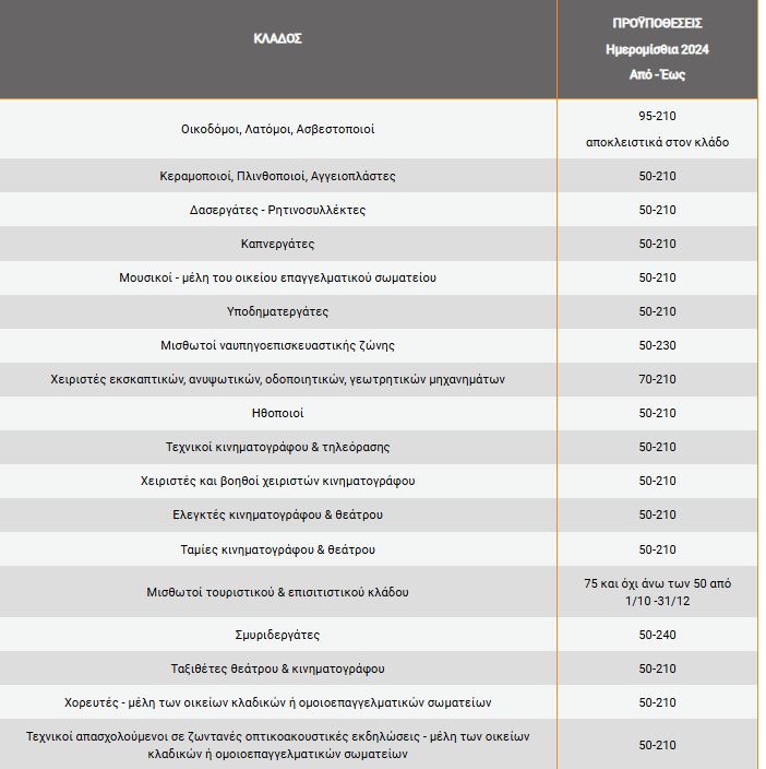 οικοδόμου, λατόμου, ασβεστοποιού, πλινθοποιού, αγγειοπλάστη, δασεργάτη, ρητινοσυλλέκτη, καπνεργάτη, μουσικού μέλους του οικείου επαγγελματικού σωματείου, υποδηματεργάτη, μισθωτού ναυπηγοεπισκευαστικής ζώνης, χειριστή εκσκαπτικών, ανυψωτικών, οδοποιητικών, γεωτρητικών μηχανημάτων, ηθοποιού, τεχνικού κινηματογράφου και τηλεόρασης, χειριστή και βοηθού χειριστή κινηματογράφου, ελεγκτή κινηματογράφου και θεάτρου, ταμία κινηματογράφου και θεάτρου, μισθωτού τουριστικού και επισιτιστικού κλάδου, σμυριδεργάτη, ταξιθέτου θεάτρου – κινηματογράφου, χορευτή – μέλους των οικείων κλαδικών ή ομοιοεπαγγελματικών σωματείων, καθώς και τεχνικού απασχολούμενου σε ζωντανές οπτικοακουστικές εκδηλώσεις – μέλους των οικείων κλαδικών ή ομοιοεπαγγελματικών σωματείων.