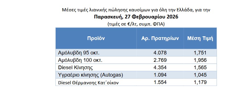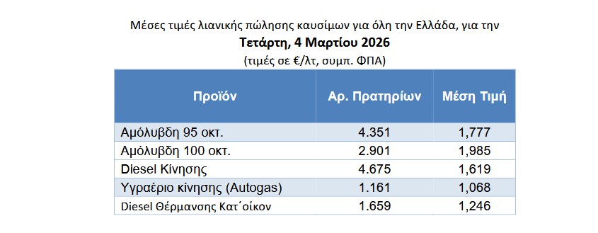Tα στοιχεία προέρχονται από το εβδομαδιαίο δελτίο τιμών καυσίμων της 27ης Φεβρουαρίου και το ημερήσιο δελτίο της 4ης Μαρτίου 2026