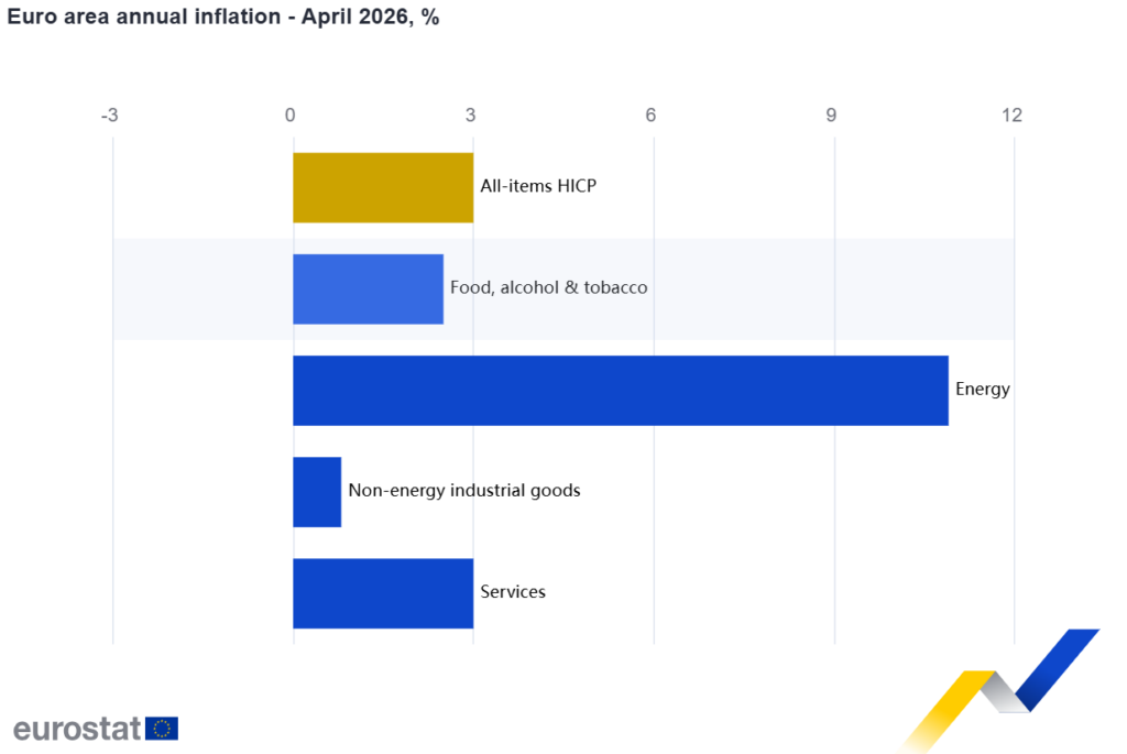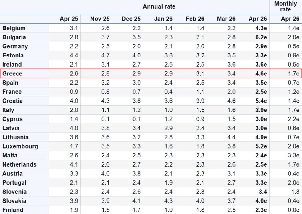 Μεγάλη άνοδο του πληθωρισμού, από 3,4% τον Μάρτιο σε 4,6% ανακοίνωσε η Eurostat, εξέλιξη που αποδίδεται στο κύμα ανατιμήσεων στα καύσιμα εξαιτίας του πολέμου στη Μέση Ανατολή και της διακοπής διέλευσης δεξαμενόπλοιων από τα Στενά του Ορμούζ. Ο πληθωρισμός στην Ελλάδα διαμορφώθηκε σημαντικά υψηλότερα από τον μέσο όρο της Ευρωζώνης, ο οποίος διαμορφώθηκε σε 3% (από 2,6% ένα μήνα νωρίτερα).